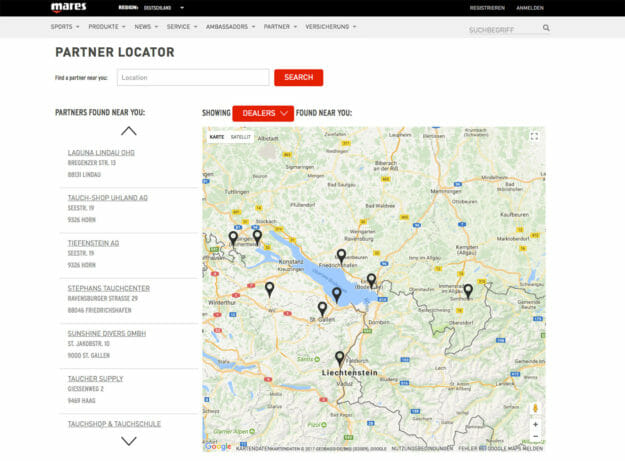 Der Mares Partner Locator zeigt alle Händler, Distributoren und Service Center weltweit an. Dabei wird sowohl die automatische Standorterkennung als auch die aufrufende Webseite berücksichtigt.